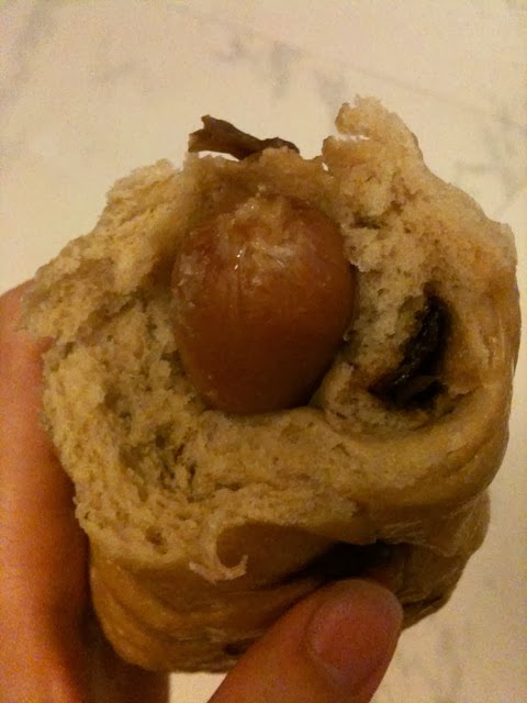 饅頭本身有嚼勁 桂圓味濃郁好吃 加上鹹鹹的香腸 這甜甜鹹鹹的組合 真的很特別 裡面可是整整一根香腸喔 這多層次的味道 一口接一口 還真的會上癮喔!