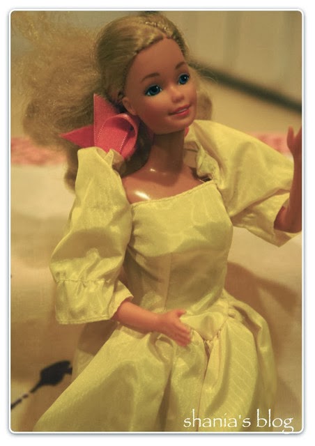 還記得當時廣告作的很火熱, 印象中算是定價比較高的芭比. 夢幻般的飄飄澎澎裙, 好美喔! 她的批巾原本有兩條, 當年粗魯的我, 已經不小心把他給扯壞了, 當初可是美美的捲捲的兩條. 現在只剩頭上那一條.