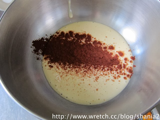 好吧!之後我就試著做獅子的頭, 先放入白色麵糊, 在用巧克力麵糊在四周呈現放射狀. 又像獅子也像太陽, 真的很有趣.