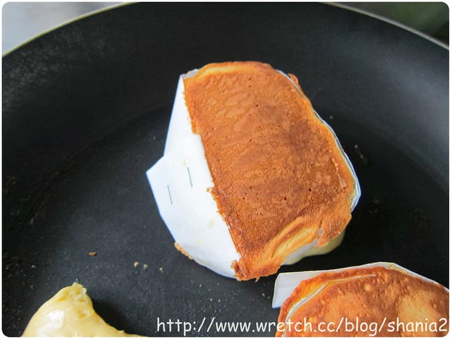 等到麵糊冒泡, 就要很小心的翻面, 麵糊會稍微液出來是正常的, 到時候在煎好在刮除多餘的部份就好了